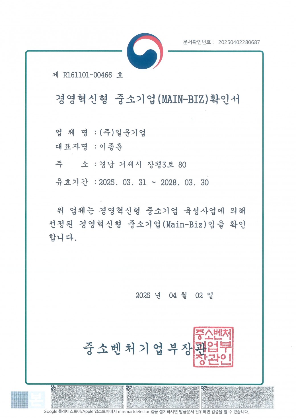 경영혁신형 중소기업(Main-Biz) 확인서 - 제 R161101-00466 호 관리자 0 925 2024.06.06 04:36 경영혁신형 중소기업(Main-Biz) 확인서 - 제 R161101-00466 호