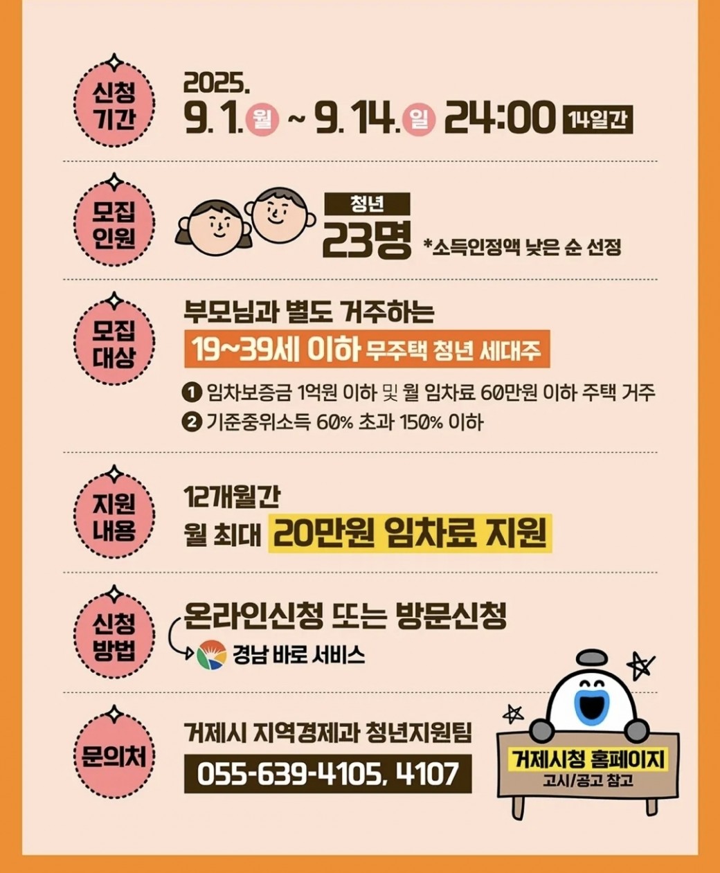[거제시 청년월세지원사업 참여자 추가 모집!]